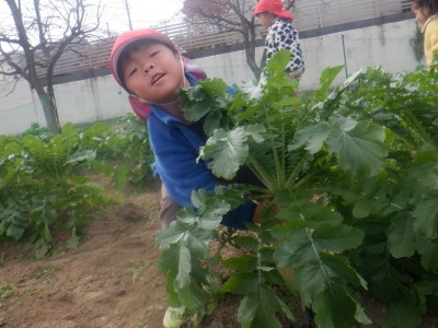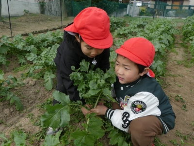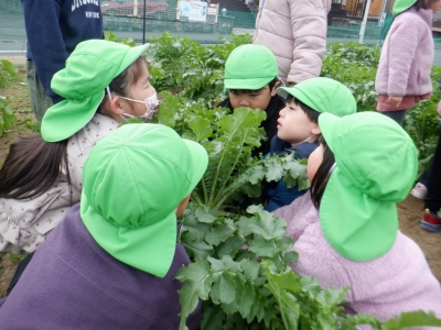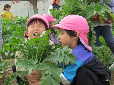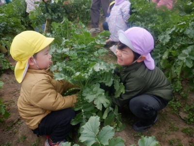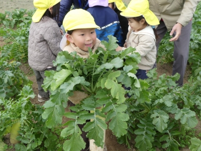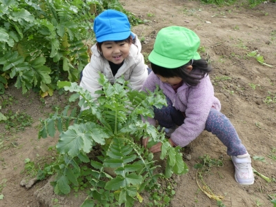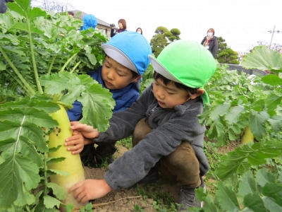 子どもたちは数多く生えている大根の中から自分たちで大きいものを選び、全身の力を使って抜きました。早く抜けた子、時間をかけて抜いた子といろいろ。年少児は年長児に手伝ってもらいました。年長児は抜いた大きな大根2本を幼稚園まで歩いて持ち帰りました。