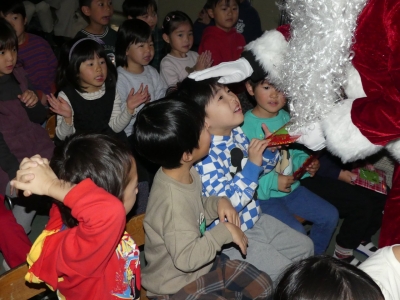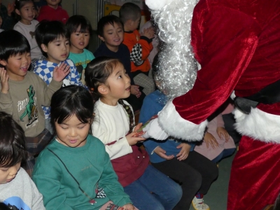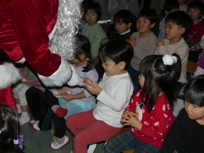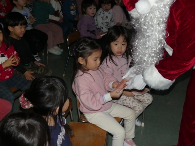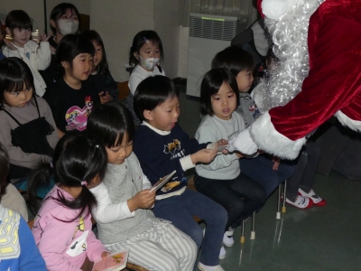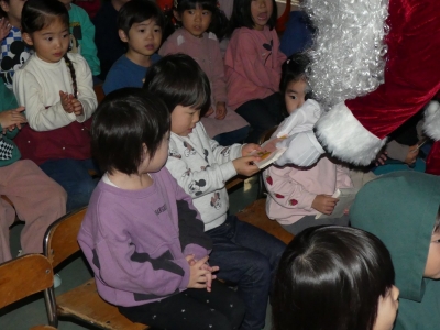 子どもたちが作ったクリスマス飾りで彩られたホールでクリスマス会を行いました。トナカイがツリーに灯りをともし、スクリーンで絵本を見た後、サンタクロースが登場。一人ひとりにプレゼントが手渡されると子どもたちのサンタの見る目は輝いていました。音楽隊の皆さんが演奏をしてくださり、素敵なクリスマス会になりました。部屋では、お菓子とリンゴジュースをいただきました。