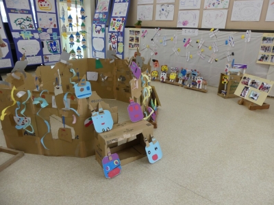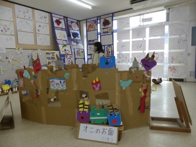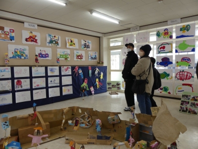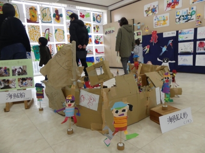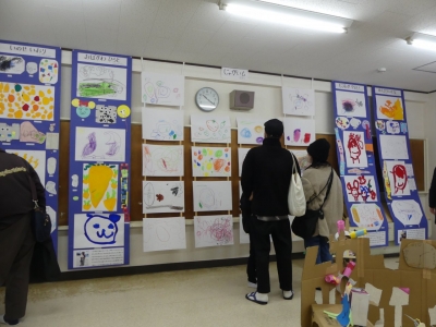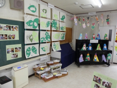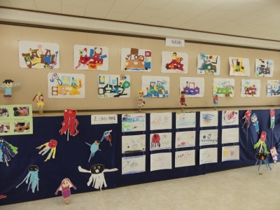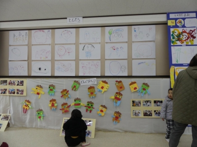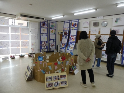 子どもたちの1年の生活の歩み、成長の様子をご覧いただくために、絵画や造形の展示を行いました。いろいろな素材、植物や小動物、友達など、子どもたちを取り巻く身近な環境との出会いが、子どもたちに驚きやうれしさなどの多くの感動を与えてくれました。子どもたちはその感動を個人または集団でのびのびと表現し楽しんで生活をしてきました。実体験を積み重ねてきたからこそ生まれる豊かな表現が、見る者に感動を与えるとともに、子どもたちの生活の充実さを物語っています。